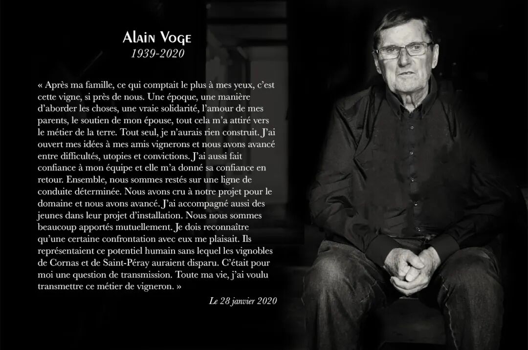 1958年,年仅19岁的Alain Voge跟随父亲管理家族葡萄园,几年后,父亲不幸去世,Alain Voge接管酒庄,开始了独立酿酒的生涯。有着对家乡土地的满腔热情,年轻却颇有远见的Alain Voge做出了许多大刀阔斧的改革,在已经废弃多年的山坡重新种植葡萄藤,放弃混合耕种的方式,以更加尊重风土的精细耕作方式照料葡萄藤,更是让被忽视的老藤重获生机。