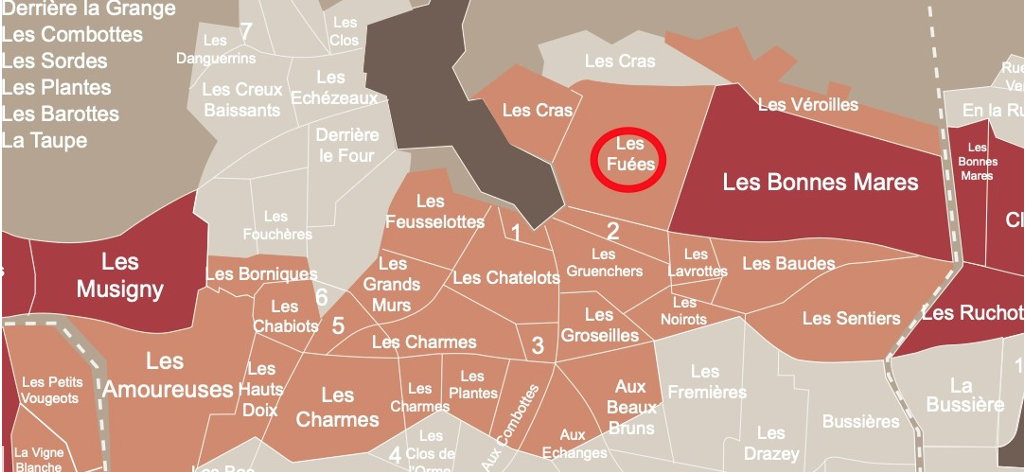 富叶园Les Fuees紧挨特级园Bonnes Mares,位于同一个高海拔的坡面上,但是更靠近凉爽的背斜谷,在全球变暖的背景下明显受益,是香波村非常值得重视的一块一级园。其位置如下方地图中红圈标记所示: