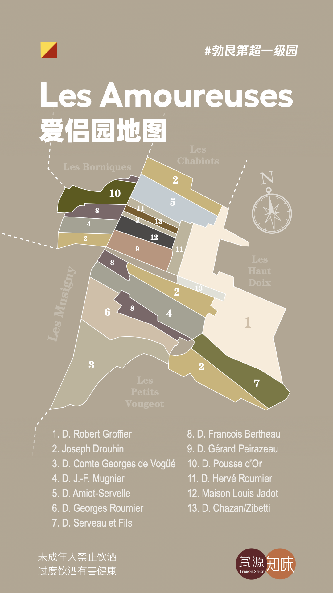 上图里显示了地主的占地分布,但其实地主们除了生产自己的葡萄酒,也会出租葡萄园或者售卖葡萄/葡萄酒,例如Domaine Faiveley就用Chazans/Zibetti地里的葡萄生产爱侣园,Gérard Peirazeau也会直接售卖葡萄/桶装酒。这样数下来,生产爱侣园的酒庄大概有三十多家,但公认品质稳定而优秀的还得来自上面这些地主当中。下面就为大家简单介绍其中特别优秀而且重要的几家。